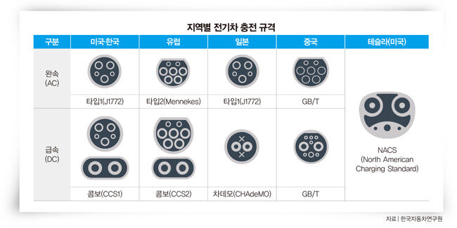 큰 틀에서 원리는 유사하지만 이제까지 국가별·기업별로 구체적인 충전 규격은 통일되지 않았다. 테슬라 NACS 규격에 왕좌를 위협받기 전 미국 시장에선 CCS가 대세였다. 다른 방식보다 고출력 충전이 용이해 속도가 빠른 것이 장점이다. 다만 통신 방식의 특성상 주파수 간섭이 일어나면 배터리 잔량 등 충전 정보에 오류가 생기는 것이 흠이다. CCS 중에서도 미국과 한국은 CCS1, 유럽은 CCS2가 대세였다. 일본의 경우 차데모(CHAdeMO) 방식을 채택했는데, CCS와 비교해 주파수 간섭 없이 원활한 충전 정보 제공이 가능하다. 다만 충전 속도가 느린 것에 비해 크기가 크고 가격이 비싼 단점이 있다. 중국은 GB/T라는 자체 규격을 고수하고 있다. 설치비용이 저렴하다는 장점과 충전 속도가 느리다는 단점이 공존한다. 이서현 한국자동차연구원 산업분석실 선임연구원은 3월 ‘전기차 급속충전 규격 표준화 동향과 시사점’이라는 제하 보고서에서 “초기에는 가장 먼저 개발된 차데모의 시장점유율이 높았으나 일본이 전기차 및 충전 기술 개발에 소극적인 사이 미국·유럽·한국의 CCS가 역전했다”면서 “차데모 개발 및 보급에서 주축이던 닛산이 최근 아리야(전기차 모델) 급속충전 표준을 CCS로 전환했는데, 이는 차데모의 열세를 뒤집기 어렵다는 것을 명확히 보여주는 사례”라고 평했다. 이 같은 흐름에 반기를 든 테슬라가 판세를 뒤바꾼 셈이다.
