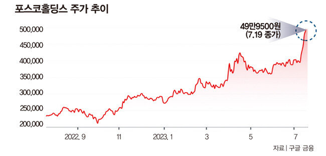 포스코그룹이 2차전지 대표 주자로 주목받으면서 지주사 포스코홀딩스의 주가 상승이 가파르다. 포스코홀딩스 주가는 7월 19일 전날보다 1만1500원(2.36%) 오른 49만9500원에 장을 마감했다(그래프 참조).