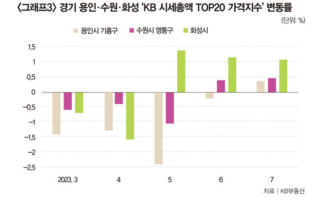 경기도 선도 아파트 가격 상승 흐름은 ‘반세권’(반도체 산업단지 인근 지역)인 용인과 화성, 수원이 주도하고 있다. 화성은 5월 이후 완연한 상승장으로 돌아섰다(그래프3 참조). 수원 영통구는 6월, 용인 기흥구는 7월 상승 반전해 미래 일자리 비전이 수도권 장세를 견인하고 있음이 확인됐다.
