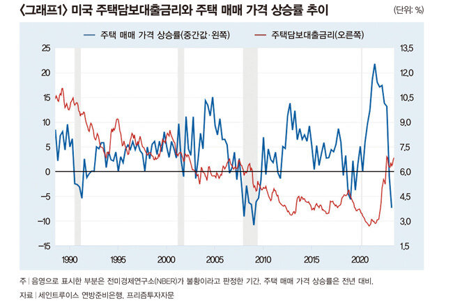 미국 경제가 당초 예상과 달리 잘나가는 이유는 부동산시장 회복 때문이다. 1990년부터 현재까지 주택담보대출금리와 주택 매매 가격의 관계를 나타내는 ‘그래프1’을 보면 주택담보대출금리가 상승할 때마다 주택 가격 급등세가 억제되는 것을 알 수 있다. 특히 2022년부터 시작된 가파른 금리인상이 주택 가격 하락을 유발했음을 확인할 수 있다. 그러나 미국 주택시장 변화를 보여주는 지표는 ‘가격’만이 아니라는 점을 염두에 둘 필요가 있다.