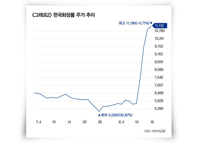 ‘유커 특수’ 기대에 중국발(發) 소비주와 여행 관련주가 빠르게 상승했다. 주가가 가장 큰 폭으로 상승한 섹터는 화장품 관련주다. 한국거래소에 따르면 화장품 중소형주인 한국화장품은 8월 10일부터 2거래일 연속 상한가를 치며 68.9% 폭등했다(그래프 참조). 8월 10일부터 16일까지 4거래일간 상승폭이 93.2%에 이른다. 같은 기간 잇츠한불은 39.8%, 제이준코스메틱은 39%, 토니모리는 34.1% 올랐다. 이 기간 한국화장품과 토니모리는 52주 신고가를 기록했다.