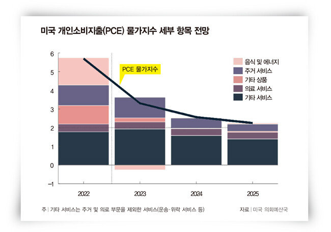 “미국 개인소비지출(PCE) 물가지수 세부 항목이다. ‘물가와 금리가 빨리 안정될 것이고, 연준도 피벗을 할 것이다. 그러니 주식시장도 지긋지긋한 상태에서 탈출할 가능성이 크다’며 기대감을 높일 수 있는데 냉정해야 한다. 미국 PCE 구성 항목 중 두 가지가 안정되지 않고 있다(그래프 참조). 의료 서비스와 기타 서비스다. 주거비 증가율은 향후 떨어질 것이라 본다. 하지만 운송비 상승률도 쉽게 떨어질까. 인건비와 밀접한 위락 서비스 비용 역시 쉽게 안 떨어질 가능성이 있다. 미국은 현재 인력 부족 문제를 겪고 있다. 장기채 금리가 일시적으로 3%대가 깨질 수는 있어도 2%대 중반에는 도달하기 쉽지 않을 것이다. 중금리 시대가 도래할 전망이다.”