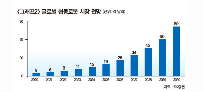 최근 로봇주 상승세가 올해 초와 다른 점은 가시적인 실적이 예상되는 협동로봇주가 주목받고 있다는 것이다. 일반적으로 로봇은 산업용 로봇과 비산업용 로봇으로 구분된다. 제조업이나 물류 등에서 사용하는 로봇은 산업용이고, 의료나 복지, 일상생활에서 사용하는 로봇은 비산업용이다. 산업용 로봇은 강한 힘으로 빠르게 움직이다 보니 작업자 안전을 위한 안전 칸막이가 필요했다. 하지만 협동로봇은 한 사람이 쓰는 작업 공간에서도 안전하고 미세하게 움직여 작업자와 나란히 일할 수 있다는 특징을 지닌다. 이 협동로봇 시장은 노동력 부족과 인건비 상승 등 사회구조 변화 속에서 빠른 속도로 성장하고 있다. SK증권에 따르면 지난해 8억 달러였던 글로벌 협동로봇 시장은 2030년 10배로 성장해 80억 달러(약 10조6600억 원)까지 커질 전망이다(그래프2 참조). 한국과학기술정보연구원(KISTI)은 글로벌 협동로봇 시장이 매년 40% 이상 성장해 2025년 6조8800억 원 넘는 시장을 형성할 것이라고 전망했다. 전 세계 협동로봇 시장 규모는 올해 7만1000대에서 2032년 43만 대로 성장하고, 산업용 로봇 시장에서 협동로봇이 차지하는 비율은 약 10%에서 32%까지 높아질 전망이다.