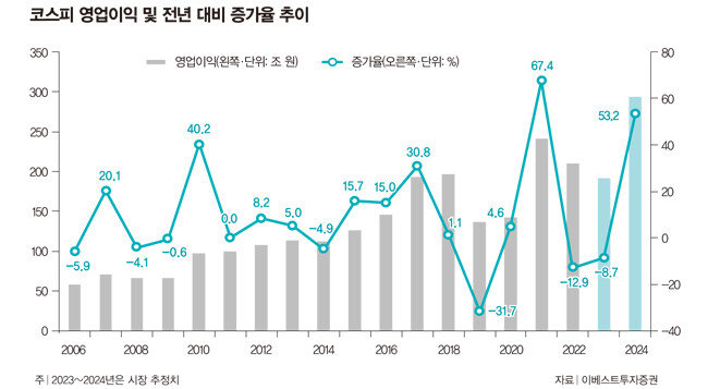 데이터 역시 심상치 않다. 이베스트투자증권 리서치센터에 따르면 시장은 2024년 한국 주요 기업의 영업이익이 전년 대비 53.2% 증가할 것이라고 전망한다(그래프 참조). 2008년 글로벌 금융위기 전후를 놓고 봐도 2번째로 높은 수준이다. 코로나19 사태를 극복하고자 유동성을 대거 풀었던 2021년만이 내년 이익 증가율 기대치를 웃돌 뿐이다. “시장에 낙관이 과도한 것 아니냐”는 우려가 나오는 이유다. 다음은 윤 대표와 나눈 일문일답.