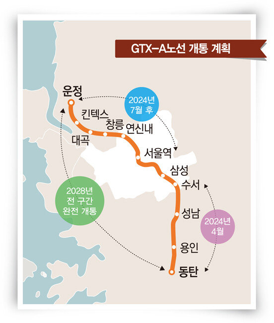GTX-A는 경기 파주시 운정역에서 서울역을 거쳐 경기 화성시 동탄역을 잇는 82.1㎞ 길이의 노선이다(지도 참조). 2024년 4월 수서~동탄 구간이 먼저 개통한 후 같은 해 하반기 운정~서울역 구간 운행이 시작될 전망이다. 서울시가 위탁받아 건설하는 GTX-A 삼성역 정거장이 완공되는 2028년에 전 구간이 개통된다. GTX-A 열차의 운행 속도는 최대 180㎞/h로 일반 지하철의 2배 수준이다. 이번 시운전에서 열차는 수서~동탄 구간을 무정차 운행해 17분 만에 주파했다. 역마다 정차하는 실제 운행에서는 28분이 걸릴 전망이다. 같은 구간을 기존 대중교통으로 이동할 경우 1시간 30분 넘게 걸린다는 점을 감안하면 GTX-A 노선 개통으로 소요시간이 3분의 1로 대폭 줄어드는 것이다. 국토부는 시운전에 이어 10월 4일 GTX-A 수서~동탄 구간 사업시행사인 SG레일과 운영 위수탁 협약을 맺는 등 개통 준비에 속도를 내고 있다.
