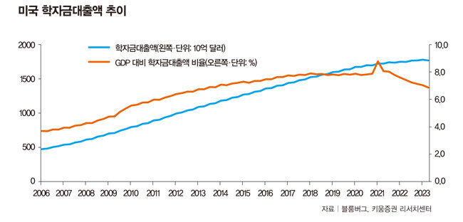 미국 싱크탱크 브루킹스연구소에 따르면 새로운 학자금대출 보조는 대학 등록금을 끌어올리는 결과를 가져오고, 결국 SAVE 플랜에 따른 총부채 탕감액이 급등할 수 있다. 과거에도 로스쿨에 대한 대출 상환 지원 프로그램을 도입한 이후 로스쿨 등록금이 상승한 바 있다. 현 시점에서 학자금대출 상환 이슈는 소비에 미치는 영향에 초점이 맞춰졌지만 점차 부채 증가로 이어지는 만큼, 내년 대선과 맞물리면서 재정 및 정부 부채 문제를 자극할 가능성이 있다.