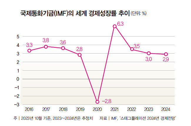 국제통화기금(IMF)은 10월 초 발표한 ‘세계경제 전망’에서 세계 경제성장률이 지난해 3.5%에서 올해 3.0%, 내년 2.9%로 둔화할 것으로 전망했다(그래프 참조). 한국 경제성장률 전망치는 그보다도 낮다. 올해는 한국 정부·한국은행의 공식 전망치와 같은 1.4%, 내년은 종전보다 0.2%p 낮춘 2.2%다. 올해 한국 경제성장률은 잠재성장률 2%에도 미치지 못한다. 잠재성장률은 노동·자본 등을 최대한 투입해 물가를 자극하지 않고 달성할 수 있는 최대 성장률로, 한 나라 경제의 기초체력을 보여주는 지표다.