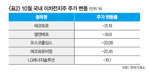 한국 이차전지 기업들은 ‘전기차 업황 둔화’에 ‘리튬 가격 하락’이라는 이중고를 겪고 있다. 한국자원정보서비스에 따르면 지난해 11월 ㎏당 581.5위안(약 10만6440원)까지 치솟았던 중국 탄산리튬은 올해 10월 30일 155.5위안(약 2만8460원)으로 급락했다. 1년 사이 리튬 가격이 73.26% 떨어진 것이다. 시장에서는 리튬 가격 하락세가 4분기에도 지속될 것으로 전망한다.이차전지 대장주 에코프로는 9월과 10월 각각 주가가 28.32%, 31.19% 급락해 60만 원 선이 깨지기도 했다(표2 참조). 김현수 하나증권 연구원이 8월 3일 매도 리포트를 내며 제시한 목표주가 55만5000원을 목전에 둔 것이다. 포스코홀딩스와 LG에너지솔루션 등 한국 주요 이차전지 관련 기업도 10월 주가가 20% 전후로 하락했다. 주가 하락이 가장 큰 에코프로는 고점 대비 주가가 반토막 난 상황이다.