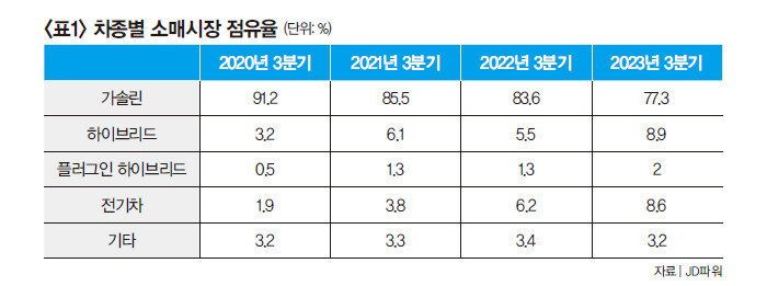 그사이 하이브리드 차량이 대체재로 부상했다. 미국 시장조사업체 JD파워에 따르면 코로나19 사태 이후 급격히 늘어난 전기차 소매 판매 점유율 증가세가 올해 들어 꺾이기 시작했다(표 참조). 특히 상대적으로 저렴한 하이브리드 차량 판매가 늘면서 3분기 전기차의 소매 판매 점유율을 추월하는 현상도 관측됐다.