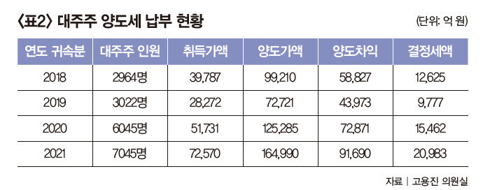 일각에서는 대주주 기준 완화는 소수를 위한 ‘부자 감세’라는 우려의 목소리도 나온다. 실제로 지난해 종목당 10억 원 이상 보유해 주식 양도세를 신고한 대주주는 7045명으로 전체 투자자의 0.05%에 불과한 것으로 나타났다(표2 참조). 더불어민주당 고용진 의원이 국세청으로부터 제출받은 ‘2019~2021년 상장주식 양도세 현황’ 자료에 따르면 지난해 양도세 신고분(2021년 귀속분) 기준 대주주는 2021년 대비 1000명 늘어난 7045명으로 집계됐다. 이들은 7조2570억 원에 취득한 주식을 16조4990억 원에 매도해 수수료와 거래세 등 경비를 빼고도 2배 넘는 9조1690억 원의 양도차익을 낸 것으로 나타났다.
