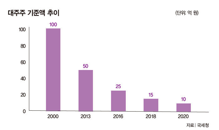 대주주 제도는 2000년 처음 도입됐다. 당시 대주주 기준은 상장 주식 한 종목을 100억 원 보유한 경우였으나 점차 요건이 강화되면서 2013년에는 50억 원, 2016년에는 25억 원, 2018년에는 15억 원으로 낮아졌고 2020년 10억 원으로 강화됐다(그래프 참조). 2021년 문재인 정부는 대주주 기준을 3억 원까지 내리려다가 홍남기 전 경제부총리가 반대하면서 접기도 했다. 반면 윤석열 대통령은 지난 대선에서 대주주 양도세 폐지와 불법 공매도 금지를 공약으로 내건 바 있다. 현재 정부는 대주주 기준을 50억 원이나 100억 원으로 완화하는 방안을 검토하는 것으로 알려졌다. 대주주 기준액 상향은 국회 입법 절차 없이 소득세법 시행령 개정만으로 가능해 연말 이전에 시행할 수 있다.