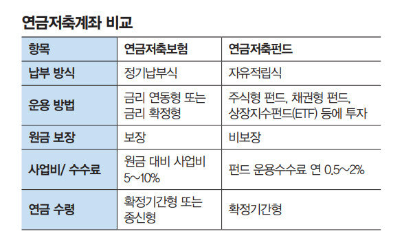 연금저축의 장점을 알고 올해 납부 한도를 채워 99만 원 세액공제를 받기로 결심했다면 다음 고민은 연금저축보험과 연금저축펀드 가운데 어느 것이 나은가 하는 점이다. 두 상품의 공통점은 앞서 설명했고, 차이점은 다음과 같다.먼저 연금저축보험은 매달 일정 금액을 납부하면 보험사가 알아서 관리해줘 편하다는 장점을 지닌다. 하지만 보험사가 수익률 개선 의지가 그리 높지 않고, 가입자와 보험사가 생각하는 원금이 다르다는 문제점이 있다. 보험사 광고 속 연금저축보험의 공시금리는 시중은행 금리보다 높아 보인다. 하지만 이 공시금리는 가입자가 낸 금액에서 사업비를 제외한 금액을 원금으로 계산한 금리다.