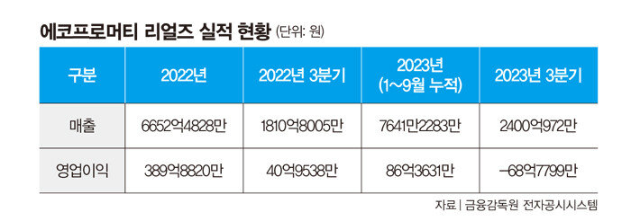 여기에 에코프로비엠의 대규모 수주 소식도 에코프로머티 주가를 끌어올렸다. 에코프로비엠은 2024~2028년 5년간 삼성SDI에 양극재 44조 원어치를 공급하기로 했는데, 이때 에코프로비엠이 에코프로머티로부터 전구체를 납품받아 양극재를 생산하는 구조라 실적이 동반 개선될 전망이다. 에코프로머티는 올해 3분기(7~9월) 약 69억 원 영업손실을 기록한 바 있다(표 참조).