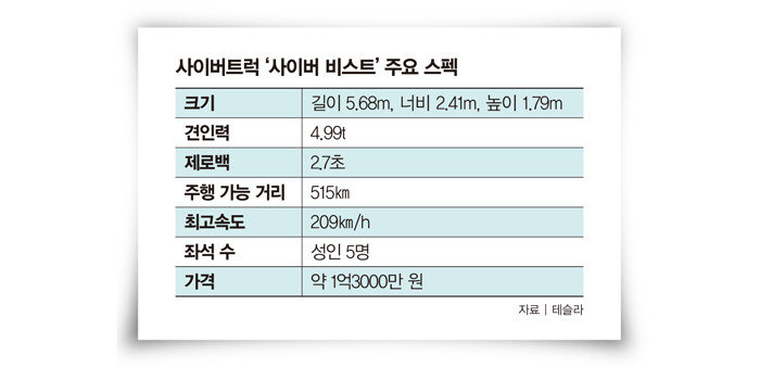 오랜 준비 기간을 거친 만큼 사이버트럭의 스펙은 화려하다. 제로백은 최상위 모델 ‘사이버 비스트’ 기준 2.7초에 불과하다(표 참조). 픽업트럭이지만 내연기관 자동차 가운데 가장 빠른 차종으로 꼽히는 ‘포르쉐 911’의 속도에 뒤지지 않는다. 일론 머스크 테슬라 최고경영자(CEO)는 11월 30일 사이버트럭을 선보이며 두 차량의 레이스 영상을 공개했는데, 결과는 사이버 비스트의 승리였다. 특히 사이버 비스트가 포르쉐 911을 견인한 상태로 레이스를 펼친 사실이 영상 말미에 나와 충격은 배가됐다. 길이 5.68m, 너비 2.41m에 달하는 사이버트럭은 한 번 충전으로 약 515㎞를 주행할 수 있다(사이버 비스트 기준). 적재용량이 1.1t에 불과해 픽업트럭치고는 적다는 평가를 받지만 견인력은 약 5t으로 양호하다. 가격은 모델에 따라 6만990~9만9990달러(약 8000만~1억3000만 원)에 달한다.