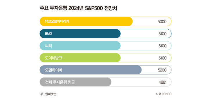“연간으로 봤을 땐 분명 긍정적이다. 최근 많은 IB가 S&P500 지수 전망치를 5000 이상으로 올려 잡았다(그래프 참조). 근거는 주당순이익(EPS)이다. S&P500 기업 평균 EPS 250에 주가수익비율(PER) 20을 곱하면 5000 정도가 나온다. 연간 기업 실적이 전망치에 미치지 못하면 살짝 깎일 순 있겠지만 거의 틀리지 않을 것으로 보인다. 또 한 가지 지표는 미국의 높은 국내총생산(GDP) 성장률이다. 지난해 3분기 기준 4.9%다. 지금 GDP 성장률 4.9%가 나오는 나라는 미국뿐이다. 기업 실적이 받쳐주고 경기도 좋으니 올해 증시엔 단점이 거의 안 보이는 게 사실이다.”