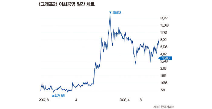 1월 2일에는 이재명 대표가 부산 가덕도 신공항 현장을 방문하던 중 피습을 당했다는 소식에 ‘이재명 테마주’가 강세를 보였다. 대표적인 이재명 테마주로는 동신건설, 에이텍, 토탈소프트 등이 꼽힌다. 동신건설은 회사 위치가 이 대표의 고향인 경북 안동에 있다는 이유로 떠올랐고, 에이텍은 신승영 대표가 이 대표의 성남시장 시절 ‘성남창조경영 CEO 포럼’ 운영원을 맡았다는 이유로 묶였다. 토탈소프트는 최장수 대표가 이재명 대표와 같은 중앙대 동문이라는 점이 부각됐다. 지난해 12월에는 민주당 이낙연 전 대표가 신당 창당을 공식화하자 ‘이낙연 테마주’가 출렁이기도 있다. 관련주는 이 전 대표의 동생이 고문으로 있는 삼환기업 계열사인 남선알미늄과 남선알미우, 이 전 대표의 서울대 동문이 대표를 맡고 있는 부국철강 등이다.국내 증시에서 정치테마주가 기승을 부리기 시작한 건 2007년 대선 때부터다. 당시 이명박 후보가 4대강 사업을 공약으로 내세우면서 ‘4대강 테마주’가 폭등했다. 토목건축 업체 이화공영 주가는 투자금이 몰리면서 4개월 만에 25배 이상 뛰었다(그래프2 참조). 또한 지하터널 기술 회사뿐 아니라, 4대강 자전거도로 건설 소식에 자전거 관련 종목도 폭등했다. 2012년 대선 때는 친노(친노무현) 인사가 있는 우리들제약(현 팜젠사이언스)과 바른손 등 ‘문재인 테마주’, 박근혜 후보의 동생 박지만 씨가 대표로 있는 EG와 아가방컴퍼니 등에 투자 쏠림 현상이 나타났다.