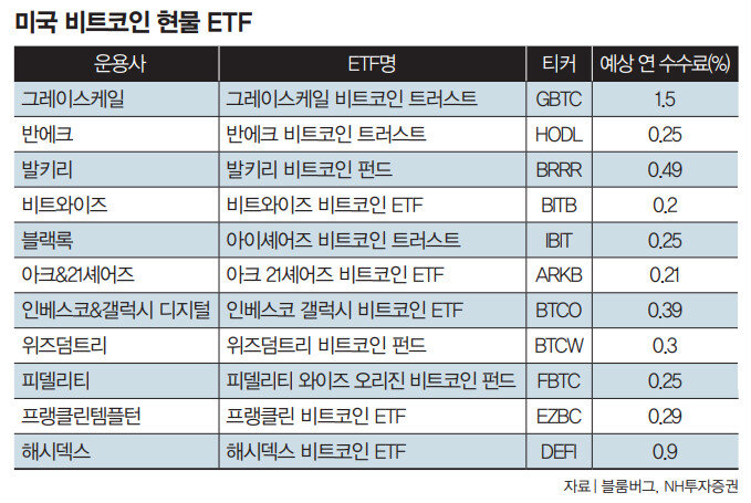 미국 증권거래위원회(SEC)가 1월 10일(이하 현지 시간) 비트코인 현물 상장지수펀드(ETF)를 마침내 승인했다. 세계 최대 자산운용사 블랙록을 포함해 그레이스케일, 비트와이즈, 해시덱스 등 상장을 신청한 11개 비트코인 현물 ETF를 모두 승인한 것이다(표 참조).