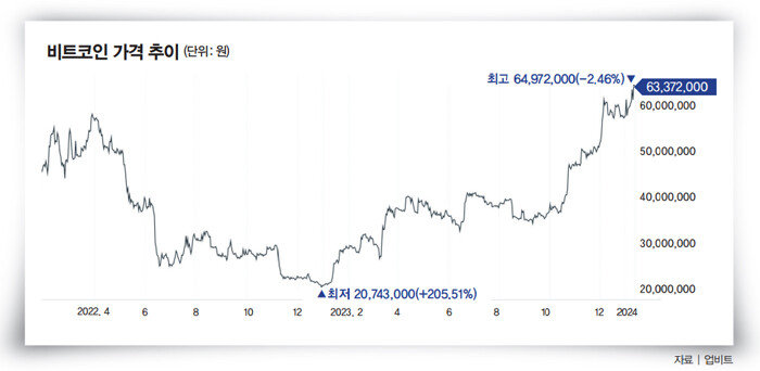 비트코인 현물 ETF 승인 소식이 나오자 시장은 곧바로 들썩였다. 1월 11일 업비트에 따르면 비트코인은 6497만2000원을 기록했다가 6200만 원대까지 하락하는 등 변동성을 보였다(그래프 참조). 2021년 12월 4일 이후 최고가다. 미국에 상장된 비트코인 관련주들은 시간외거래에서 급등했다. 비트코인 18만9150개를 보유한 마이크로스트래티지 주가는 2.55% 올랐으며, 암호화폐 채굴 업체 마라톤 디지털 홀딩스와 라이엇플랫폼스 주가는 각각 6.18%, 4.26% 상승했다. 암호화폐거래소 코인베이스는 5.98% 급등했다. 1월 11일 국내 증시에서는 암호화폐 관련주로 꼽히는 우리투자기술과 한국투자증권우 등이 상한가를 기록했다.
