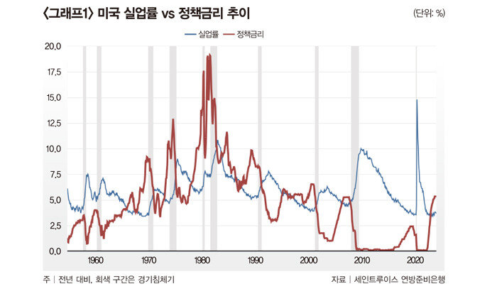 미 연준의 정책 변화에 가장 직접적인 영향을 미치는 변수는 실업률이다. ‘그래프1’은 미국 실업률과 정책금리의 관계를 보여주는데, 실업률이 상승할 때마다 정책금리가 지체없이 인하되는 것을 볼 수 있다. 대표적인 예가 2020년으로, 코로나 팬데믹 속에 단행된 ‘사회적 거리두기’ 조치로 실업률이 급격히 상승하자 정책금리가 제로(0)까지 인하된 바 있다.