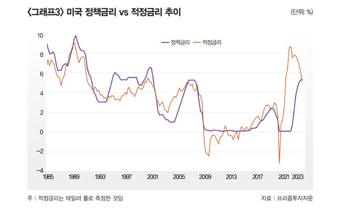 예를 들어 인플레이션이 목표 수준인 2%를 훨씬 상회할 때는 적정금리가 더 높아질 것이며 반대로 실업률이 역사상 평균에 비해 높을 때는 적정금리가 낮아지는 식이다. 이렇게 측정한 ‘적정 정책금리’는 ‘그래프3’과 같다. 보라색 선은 정책금리, 붉은색 선은 테일러 교수의 논문을 활용해 측정한 적정금리다.