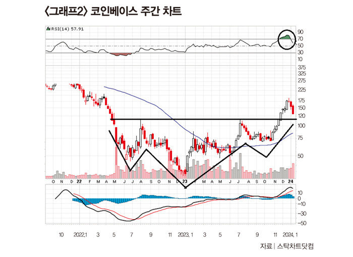 “코인베이스 주간차트를 보면 2022년 5월에서 지난해 11월말에 걸쳐 역머리어깨형을 완성했다(그래프2 참조). 이후 거래량이 증가하면서 중기적으로 상승세로 전환했다. 지난해 12월말까지 8주 연속 상승한 이후 조정을 보이고 있다. 주가 고점에서 나타난 전형적인 조정신호로 RSI(상대강도지수)와 MACD 등 보조지표들도 하락전환하고 있다.”