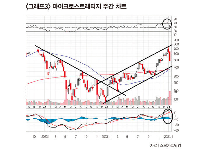 “마이크로스트래티지 주식은 투자 수익률 측면에서 비트코인보다 더 큰 성과를 보여주고 있다. 마이크로스트래티지의 주간차트를 보면 2021년 11월 이후 지속된 중기 하락추세선을 지난해 1월 상향 돌파했다(그래프3 참조). 이후 단기 상승 후 조정을 보였으나 중기 하락추세선으로 복귀하지 않고 새로운 상승추세대를 형성하면서 상승흐름을 이어가고 있다. 지난해 12월말 상승추세대 상단에서 저항을 받으면서 주가는 조정을 보이고 있으며 추가 조정도 예상된다.”