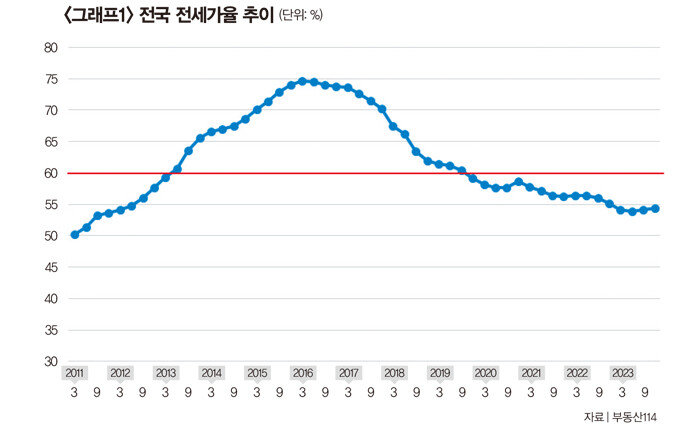 전세 가격이 턴어라운드하면서 전세가율 역시 상승세로 접어들었다. 서울뿐 아니라, 전국 전세가율은 지난해 6월 53%를 저점으로 반등해 올해 초 55%까지 상승했다(그래프1 참조). 전세 가격이 매매가를 조용히 타고 올라가면서 올해 전국 전세가율은 50%대를 넘어 60%대에 도달할 전망이다. ‘전세가율 60%’는 부동산시장에 시사하는 바가 크다. 과거 글로벌 금융위기로 침체됐던 부동산시장이 전세가율 60% 돌파 이후 장기 상승 모드로 전환했기 때문이다. 정확히는 전세가율 60%를 넘겼던 2013년을 보내고 수도권 부동산시장이 장기 상승궤도에 올라탔다. 신축 공급량 감소, 매매가와 전세가의 엇갈린 사이클을 고려하면 올해가 바로 그런 한 해가 될 전망이다.
