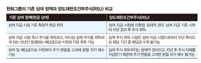 국내에서는 다소 생소한 RSU는 연말연초에 현금으로 주는 기존 성과급제도와 달리 일정 기간이 지나야 주식을 주는 장기성과보상제도다. 한화의 경우 최소 5년에서 최대 10년간 이연해 지급한다. 또한 임직원의 장기적인 경영 참여를 유도하고 미래 성과 창출까지 고려해 부여하기 때문에 연초 보직 부임 시 지급을 약정하는 것이 일반적이다.
