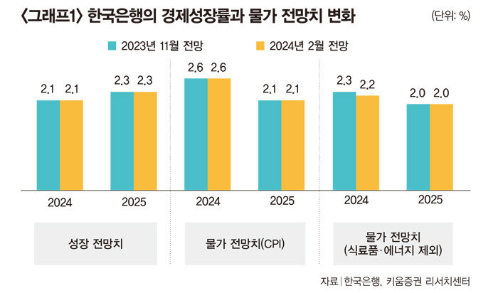 한국은행은 이번 회의에서 수정 경제전망도 함께 발표했다. 한국은행은 1년에 4번 경제전망과 수정본을 공개한다. 이번에 발표된 전망치는 지난해 11월 발표한 전망을 일부 수정한 내용으로 큰 변화는 없었다(그래프1 참조). 올해 경제성장률은 연간 2.1%로 종전 전망치를 유지했으며, 소비자물가상승률도 연간 2.6% 전망 수준에서 변하지 않았다. 다만 에너지와 식료품을 제외한 근원 소비자물가 전망치는 2.2%로 종전보다 0.1%p 하향 조정해 예상보다 둔화폭이 확대될 것으로 내다봤다. 근원 소비자물가 수정은 내수 소비가 생각보다 부진할 것이라는 점에 기인한다. 수출은 예상보다 양호해 올해 경제성장률 전망치를 유지하지만, 내수 부진으로 수요 측면의 인플레이션 압력이 완화되리라 전망한 것이다.