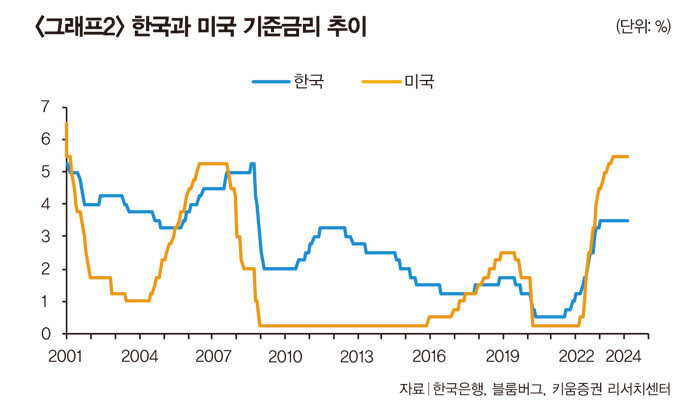 그렇다면 올해 한국은행이 금리를 내릴 가능성이 있을까. 과거 한국은행은 대체로 물가가 안정적인 상황에서 수출이 부진할 때 기준금리 인하를 단행했다. 최근 한국 경제는 소비와 건설투자 등 내수는 부진하지만 수출 증가율은 플러스로 전환하며 양호하다. 또한 소비자물가상승률도 여전히 2% 후반에 머물러 있어 당분간 기준금리 인하는 쉽지 않은 상황이다.