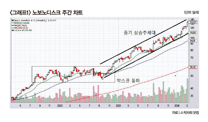 “노보노디스크 주간 차트를 보면 2021년 8월부터 2022년 11월 중순까지 박스권을 형성했다가 박스권을 상향 돌파하면서 본격적인 상승 흐름을 이어오고 있다(그래프1 참조). 이 흐름에서 상승추세대 하단이 주요 지지선 역할을 한다는 것을 알 수 있다. 다만 현재 상승추세대 상단에 접근하고 있어 단기적 조정이 예상된다. MACD(Moving Average Convergence Divergence) 보조지표도 사상 최고치를 보이고 있어 단기 과열에 따른 조정 우려가 있다.”