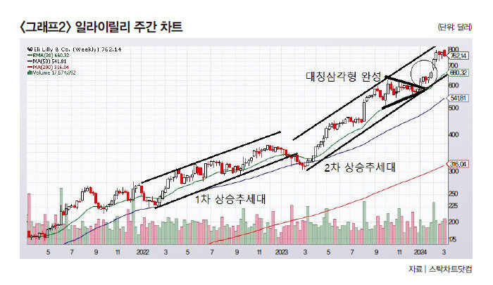 “주간 차트를 보면 현재 2차 상승을 하고 있다(그래프2 참조). 1차 상승은 2022년 2월부터 12월까지 진행됐다. 지난해 3월 이후 진행 중인 2차 상승은 상승세가 주춤하면서 지난해 10월부터 12월까지 방향성 탐색국면이 있었다. 이때 패턴상 대칭삼각형이 완성됐는데, 위쪽으로 방향성이 나타나면서 올해 들어 상승 흐름이 재개됐다.”