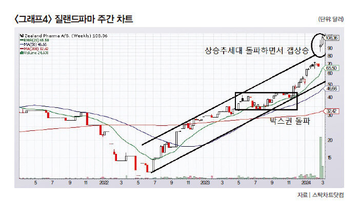 “미국 증시에서 장외거래로 거래되고 있어 일반투자자는 접근하기가 쉽지 않다. 하지만 국내 비만치료제 ETF(상장지수펀드)에 편입돼 있어 ETF를 통한 투자는 가능하다. 다만 현재 질랜드파마는 단기간에 갭상승하며 폭발적인 상승 흐름 나타내고 있기 때문에 추격매수는 무리가 있어 보인다. 질랜드파마의 1차 저항선은 120달러(약 15만7770원) 내외로, 추가 상승을 보이면 새로운 추세대를 형성할 것으로 예측된다. 조정 시 주요 지지선은 65~70달러(약 8만5460~