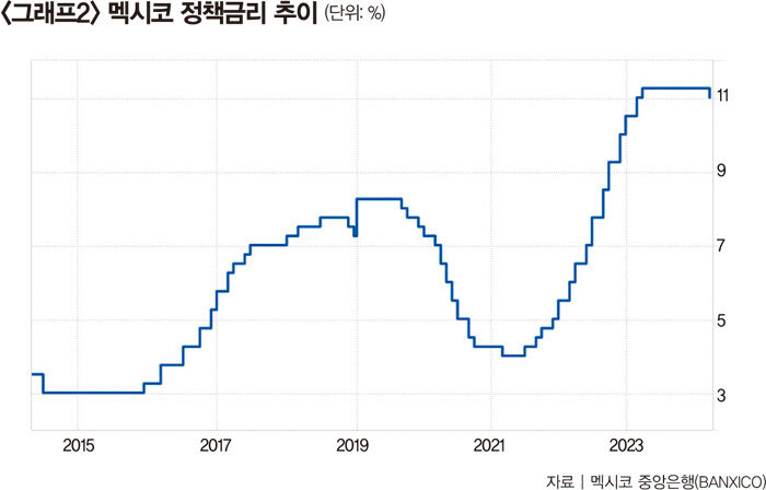 결국 남은 문제는 엔 캐리 트레이드 청산 가능성이라고 볼 수 있다. 엔화 강세를 예상한 투자자들이 일본에서 빌린 돈을 반환하려고 멕시코 페소화 포지션을 정리하는 과정에서 금융시장 변동성이 커질 수 있기 때문이다. 더욱이 최근 멕시코 중앙은행이 정책금리를 기존 11.25%에서 11.00%로 인하해 엔 캐리 트레이드 수익률 하락 가능성이 점쳐지고 있다(그래프2 참조).