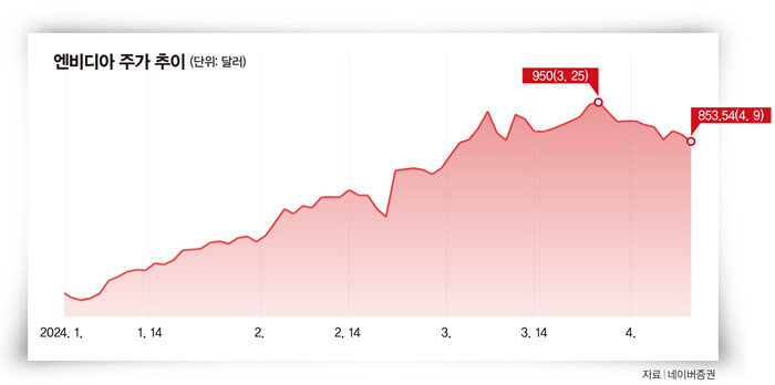 엔비디아 주가 흐름은 어떻게 보나. 최근 900달러 선이 무너졌다(그래프 참조).
