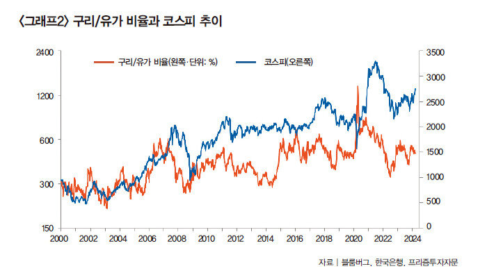 가장 대표적 시기가 2021년 하반기다. 당시 구리 가격 상승 탄력이 서서히 꺾이는 가운데 러시아의 우크라이나 침공 위험이 부각되며 유가 상승세가 본격화됐다. 이후 구리/원유 가격 비율이 가파른 하락세를 보이기 시작했다(그래프2 참조). 기름 한 방울 나지 않는 한국 경제 입장에서 원유 가격 인상은 원가 부담을 높이는 반면, 구리 가격 상승 제약은 기업 마진이 줄어들게 만든다.