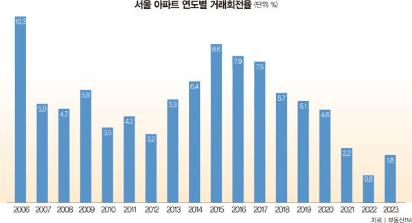최악의 거래 가뭄이던 2022년 서울 아파트 거래회전율은 0.6%였다(그래프 참조). 아파트 100채당 1건이 채 거래되지 않은 해였다. 지난해 거래회전율은 2022년보다 증가했지만 장기 평균 수준을 크게 하회하는 1.8%를 기록했다. 100채당 약 2건의 거래가 겨우 성사됐다는 의미다. 서울의 장기 평균 거래회전율은 거래 과열이 극심하던 2006년을 제외하면 연 4.8% 수준이다. 이는 1000채 규모의 대단지 아파트가 1년에 50건 정도 거래가 이뤄졌음을 의미한다. 올해 거래회전율은 극적인 반전이 어려워 보인다. 따라서 장기 평균 수준인 연 5%는 아니더라도 지난해 수준을 상회하는 연 3~4% 거래회전율을 보이는 아파트라면 향후 상승 전환 시 극적인 시세 분출을 이룰 것으로 보인다. 거래량 극소 국면에서 연 30~40건 거래되는 대단지 아파트를 찾는다면 부의 기회를 선점할 수 있다는 얘기다.