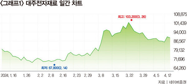 “국내에서는 압도적 1위, 글로벌에서는 3위인 대주전자재료다(그래프1 참조). 대주전자재료가 생산하는 실리콘 음극재는 포르쉐 타이칸에 들어가는데 최근 포르쉐 타이칸이 페이스리프트를 하면서 실리콘 음극재 사용량을 기존 3%에서 10%로 3배 이상 늘렸다. 가만히 앉아 판매량이 3배 이상 증가한 셈이다. 또 최근 대주전자재료의 실리콘 음극재가 SK온을 통해 현대 아이오닉에 들어가기 시작했다. 아이오닉은 하이엔드 차종인 포르쉐와 달리 볼륨화된 차종인 만큼, 이는 굉장한 상징적 의미를 갖는다. 원래 대주전자재료는 적층세라믹콘덴서(MLCC)에 들어가는 전도성 페이스트 부품 매출 비중이 컸는데 지난해부터 실리콘 음극재 매출 비중이 15%로 늘었고 올해 35%, 내년 55%로 증가할 예정이다. 또 자체 기술력으로 생산비용을 30%가량 낮춘 데 이어 3년 안에 ㎏당 30달러(약 4만1560원) 시대를 열겠다고 한 만큼 기대를 받을 수밖에 없다. 현재 실리콘 음극재 시장은 전체 음극재 시장의 1% 정도에 불과하지만 2030년 10%까지 커질 것으로 예상된다.”