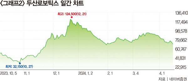 “두산로보틱스다(그래프2 참조). 시가총액이 5조 원에 육박해 주가가 비싸다고 할 수도 있겠지만 잠재력, 성장성, 기술력, 나아갈 방향성 등 면에서 가장 매력적인 기업이다. 로봇 시장은 궁극적으로는 휴머노이드 로봇으로 가겠지만 그때까지는 상당한 시간이 걸릴 테고, 당장 필요하고 많이 쓰이는 것은 협동로봇이다. 두산로보틱스는 연평균 35%씩 성장하는 협동로봇 시장에서 글로벌 4위다. 3위인 대만 테크맨로봇과 시장 침투율이 0.9%p밖에 차이가 안 난다. 현재 연 3200대를 생산하는 두산로보틱스는 2027년까지 시장 침투율을 20%까지 높이겠다는 계획인데, 현 글로벌 협동로봇 시장 규모가 6만 대이니 3년 동안 4배 성장시키겠다는 얘기다. 또 두산로보틱스는 제품군이 13개로 다양해 확장 가능성이 크다. 또 북미와 유럽에서 매출이 60% 이상씩 성장하고 있다. 다만 지난해 단기간에 주가가 폭등해 비싼 것이 흠이었는데, 올해 들어 이에 대한 부담감으로 40%가량 빠졌다.”