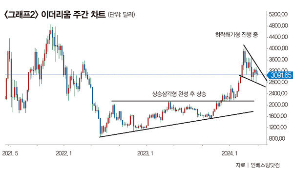 “이더리움 주간 차트를 보면 2022년 6월부터 지난해 11월 말까지 중기적으로 상승삼각형 패턴을 형성한 후 주가가 한 단계 상승했다(그래프2 참조). 이후 올해 3월 중순부터 현재까지 하락쐐기형 패턴을 형성 중이다. 일반적으로 하락쐐기형 패턴은 상승 추세에 일시적으로 나타나는 조정으로, 패턴 완성 후 중기적인 상승세를 이어갈 것으로 판단된다.”