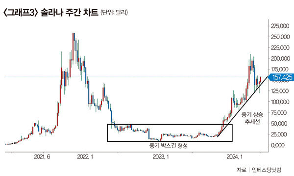 “솔라나 주간 차트를 보면 2022년 5월부터 지난해 11월 초까지 중기 박스권을 이루고 있었다(그래프3 참조). 이후 박스권을 돌파하면서 본격적인 상승 흐름을 나타내며 상승 추세선을 형성했다. 올해 4월 말 일시적으로 추세선을 하향 이탈했으나 복귀하는 모습이다.”