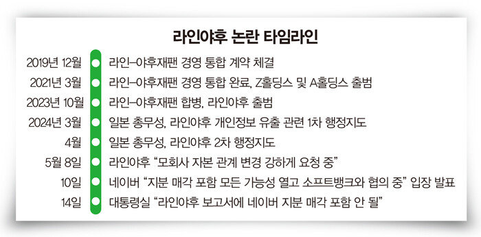 라인야후를 둘러싼 논란은 3월로 거슬러 올라간다(타임라인 참고). 일본 정부는 3월부터 네이버와 소프트뱅크가 공동 경영하는 라인야후에 ‘탈(脫)네이버’를 요구하기 시작했다. 지난해 11월 네이버 클라우드가 악성코드에 감염돼 수십만 라인야후 사용자의 개인정보가 유출된 사건이 발단이 됐다. 일본 정부는 개선책을 촉구하는 두 차례 행정지도에서 “네이버와의 자본 관계를 재검토하라”며 사실상 네이버 지분 매각을 주문했다. 라인야후 대표 서비스인 라인은 일본 ‘국민 메신저’로 통하는데, 일본 정부가 개인정보 유출 사건을 빌미로 라인야후를 완전히 일본 기업으로 만들려고 한다는 관측이 나왔다. 라인야후도 5월 8일 “모기업에 자본 관계 변경을 강력히 요청했다”는 입장을 밝혔다.