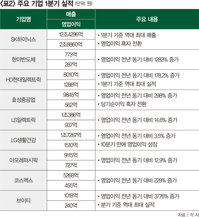 1분기 실적 발표가 막바지에 접어든 가운데 호실적을 기록한 기업들이 연일 신고가 랠리를 이어가고 있다. 개중에는 올해 주가가 2배 이상 뛴 종목도 있다(표1 참조). 인공지능(AI) 부문에 특화된 반도체주와 전력주가 가파른 상승세를 보이고 있고, 화장품주 등에서도 반전 모멘텀이 나타나고 있다. 화장품주의 경우 중국 경기가 회복되면서 산업 전반으로 온기가 확산되는 모습이다.올해 한국 증시의 중심에는 전력주가 있었다. AI 산업이 성장하면서 데이터센터가 급증하자 전력 수요가 늘어난 덕분이다. 국제에너지기구(IEA)에 따르면 2026년 전 세계 데이터센터에서 사용하는 전기량은 일본 전체 국민이 한 해 동안 쓰는 전기량(939TWh)과 같은 수준에 이를 전망이다. 전력기기 수요가 늘어나면서 국내 주요 3사인 HD현대일렉트릭, 효성중공업, LS일렉트릭은 지난해 11조4220억 원 수주 잔고를 기록했다.