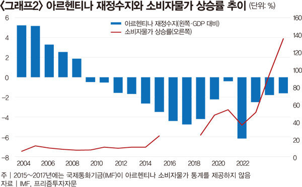 아르헨티나 대외 신인도는 2001년 발생한 약 820억 달러(약 112조 원) 규모의 채무불이행(디폴트)과 2005년 채무 재조정, 그리고 2010년 2차 채무 재조정을 통해 외채의 약 93%를 탕감받는 과정에서 바닥까지 추락했다. 그럼에도 여전히 남은 빚을 갚지 못해 2020년 또다시 디폴트를 선언했다. 이런 상황에서는 어떤 외국인투자자도 아르헨티나 채권을 사지 않기에 정부가 재정적자를 메울 방법은 돈을 찍어내는 것밖에 없다. 물론 지폐를 발행해 재정적자를 충당하는 일을 국민이 눈치 채지 못할 때는 문제가 되지 않을 수 있다. 하지만 기업들이 해외에서 발생한 매출을 국내로 가져오지 않고, 경제 상황을 신속하게 파악한 사람들이 매점매석에 나서면서 인플레이션이 걷잡을 수 없이 부풀어 오르기 시작했다(그래프2 참조).