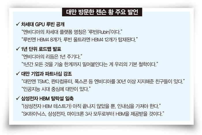 루빈에 탑재되는 AI 반도체로는 6세대 고대역폭메모리(HBM)인 HBM4가 채택됐다. 이날 황 CEO는 “지금 이 사실을 공개한 걸 후회할지도 모르겠다”면서 “블랙웰 울트라엔 5세대 HBM인 HBM3E(12단) 8개, 새로운 루빈엔 HBM4 8개, (2027년 출시되는) ‘루빈 울트라’엔 HBM4 12개가 탑재될 예정”이라고 밝혔다. ARM 아키텍처 기반의 신규 CPU ‘베라(Vera)’도 루빈에 장착된다.