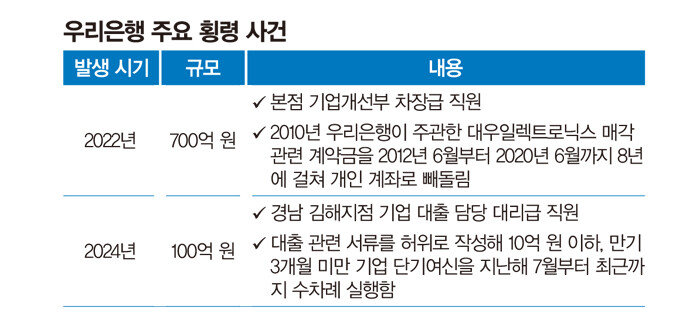 금융권 한 관계자가 최근 우리은행에서 발생한 100억 원대 횡령 사건에 대해 평가한 말이다. 우리은행은 “자체 모니터링 시스템으로 횡령 사실을 파악한 만큼 내부통제가 잘 작동했다는 증거”라고 주장하지만 허위 대출이 실행된 것 자체가 내부통제 부실 사례라는 지적이다. 2022년 700억 원대 횡령 사건으로 홍역을 치른 데 이어 우리은행이 또다시 100억 원대 유사 사건에 휘말리면서 그간 임종룡 우리금융그룹 회장이 강조해온 “빈틈없는 내부통제”에 대한 의구심이 커지고 있다(표 참조).
