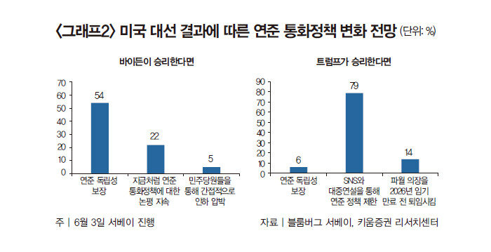 미국 대선 이슈는 양 후보의 지지율 변화를 통해 연준의 금리인하 경로에 노이즈를 만들어낼 수 있다. 주식시장에서는 트럼프 당선 시 연준에 대한 금리인하 압박, 파월 의장의 조기 퇴임 가능성 등으로 통화정책 불확실성이 커지고, 바이든 당선 시에는 연준 독립성 보장 등으로 기존 통화정책에 유의미한 영향을 미치지 않을 것이라는 의견이 주를 이룬다(그래프2 참조).