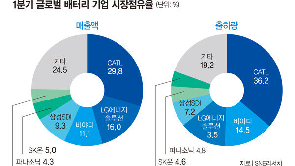 기업의 해외 진출이 늘어나면서 국내 생산 기반은 위축될 전망이다. 시장조사업체 SNE리서치에 따르면 국내 배터리 3사(LG에너지솔루션·삼성SDI·SK온)의 1분기 글로벌 배터리 시장점유율은 매출액과 출하량 기준으로 각각 30.3%, 25.3%다(그래프 참조). 하지만 이들 기업이 정부 지원책이 강한 미국 등에 진출하면서 국내 생산 기반의 상대적 비중은 줄어들고 있다. 산업조사기관 블룸버그NEF에 따르면 한국 내 배터리 생산량은 2022년 기준 1%에 불과하며, 2027년이 되면 이마저도 1% 미만으로 줄어들 전망이다.