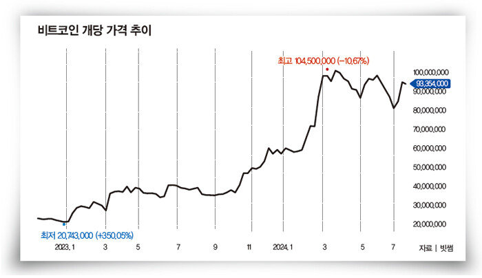 “7월 셋째 주 비트코인 가격이 120일 이동평균선(이평선)을 상향 돌파해 6만4700달러(약 9000만 원) 정도 됐을 때 일부 매수했다. 이후 6만7000달러를 넘어설 때 추가 매수했다. 비트코인이 역대 최고가인 7만1000달러를 돌파하면 나머지 투자금 전액으로 매수할 계획이다.”