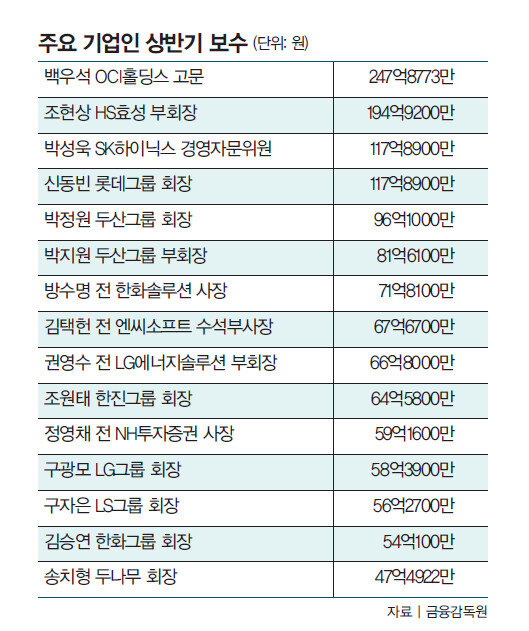 전문 경영인으로서 재계를 통틀어 상반기 보수가 가장 많았던 사람은 247억8773만 원을 받은 백우석 OCI홀딩스 고문이다. 다만 백 고문도 보수 대부분인 242억6755만 원이 퇴직금이다. OCI홀딩스 측은 “백 고문이 45년간 OCI를 국내를 대표하는 종합화학그룹으로 키운 공로를 인정받은 것”이라며 “1990년부터 34년간 임원을 지낸 것도 영향을 끼쳤다”고 설명했다.